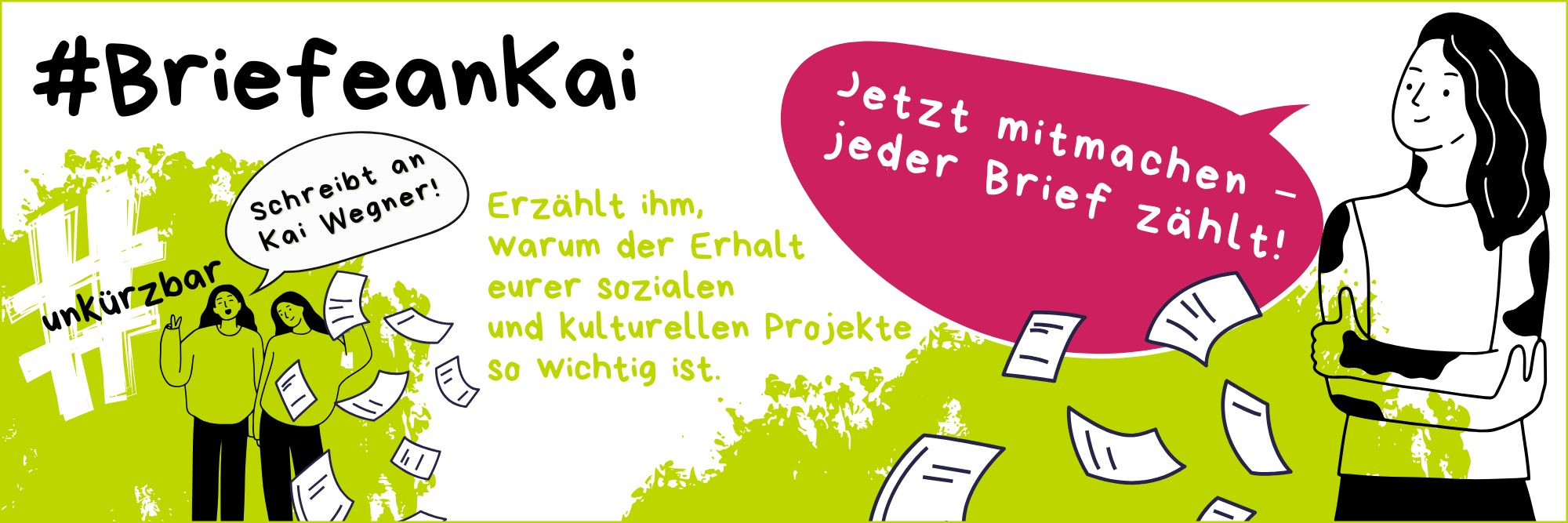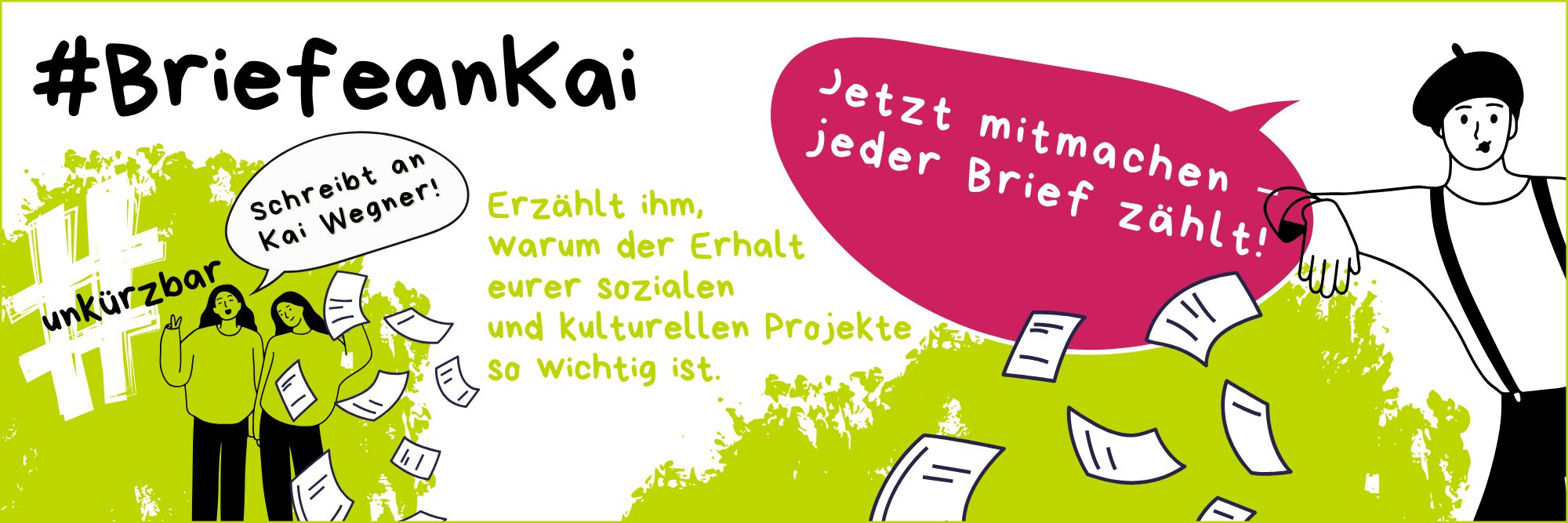 Soziale und kulturelle Angebote sind essenziell für unsere Gemeinschaft – sie fördern Zusammenhalt, Bildung und Teilhabe für alle. Doch im Raum stehen Kürzungen des Berliner Senats, die diese wichtigen Bereiche bedrohen. Damit wir gemeinsam ein starkes Zeichen setzen, rufen wir zur Aktion #BriefeanKai auf.