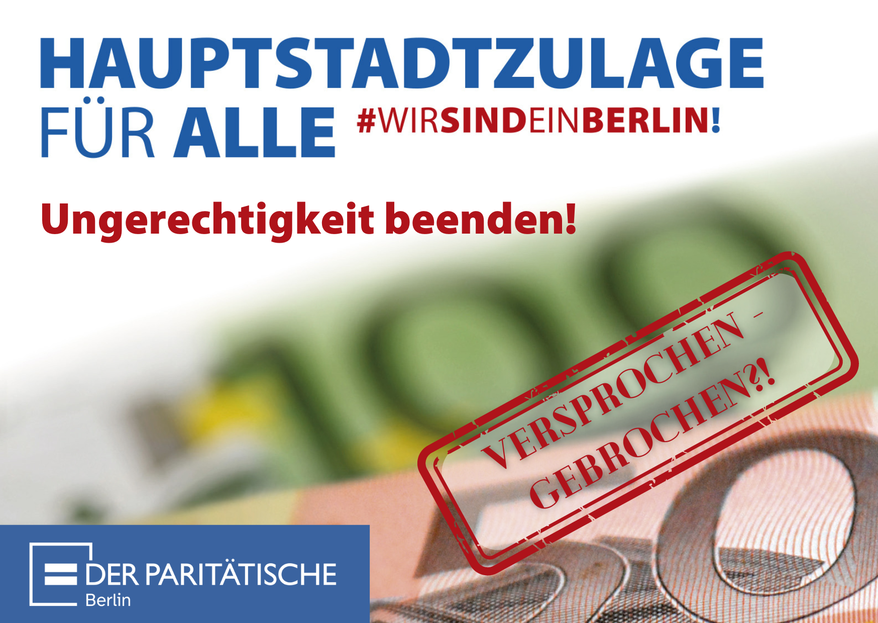 Wie jetzt jedoch bekannt wurde, plant das Land Berlin, die Hauptstadtzulage auch künftig nur an Beschäftigte des öffentlichen Dienstes zu zahlen - trotz der Zusicherung, dass auch unsere Beschäftigten die Hauptstadtzulage erhalten würden. Das nehmen wir nicht hin und fordern mit der Liga der gemeinnützigen Berliner Wohlfahrtsverbänden, die Zusage einzuhalten.